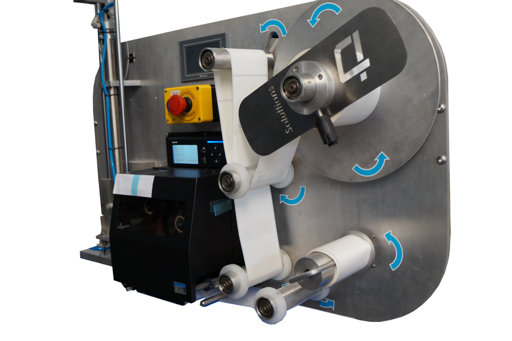 - Em um único equipamento imprime e aplica etiquetas nas embalagens.